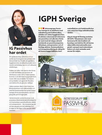 Från och med Fastighet & Bostadsrätt nr 6, 2014 till och med Fastighet & Bostadsrätt nr 5, 2015 kommer vi att kunna läsa allt aktuellt som händer inom IG Passivhus Sverige i en separat folder som följer med varje nummer av tidningen. Klicka vidare för att komma till webbversionen!