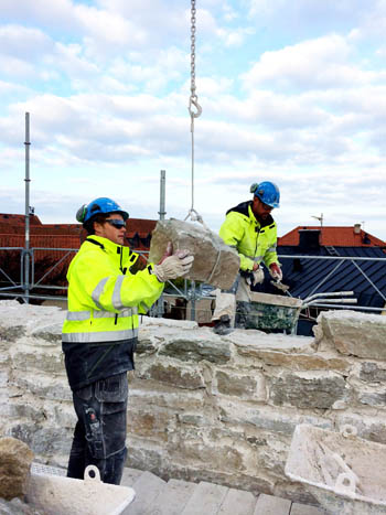 Snart är sista stenen på plats i återuppbyggnaden av Visby ringmur. 150 ton sten har murats upp med hjälp av 60 ton kalkbruk som släckts och blandats på traditionellt vis på plats. Arbetet har gått helt enligt planerna.